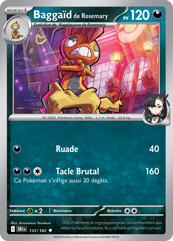 Découvrez la carte Pokémon Baggaïd de Rosemary 133/182, une carte Peu commune issue de la série Écarlate et Violet – Rivalités Destinées, une des dernières séries du bloc Écarlate et Violet.