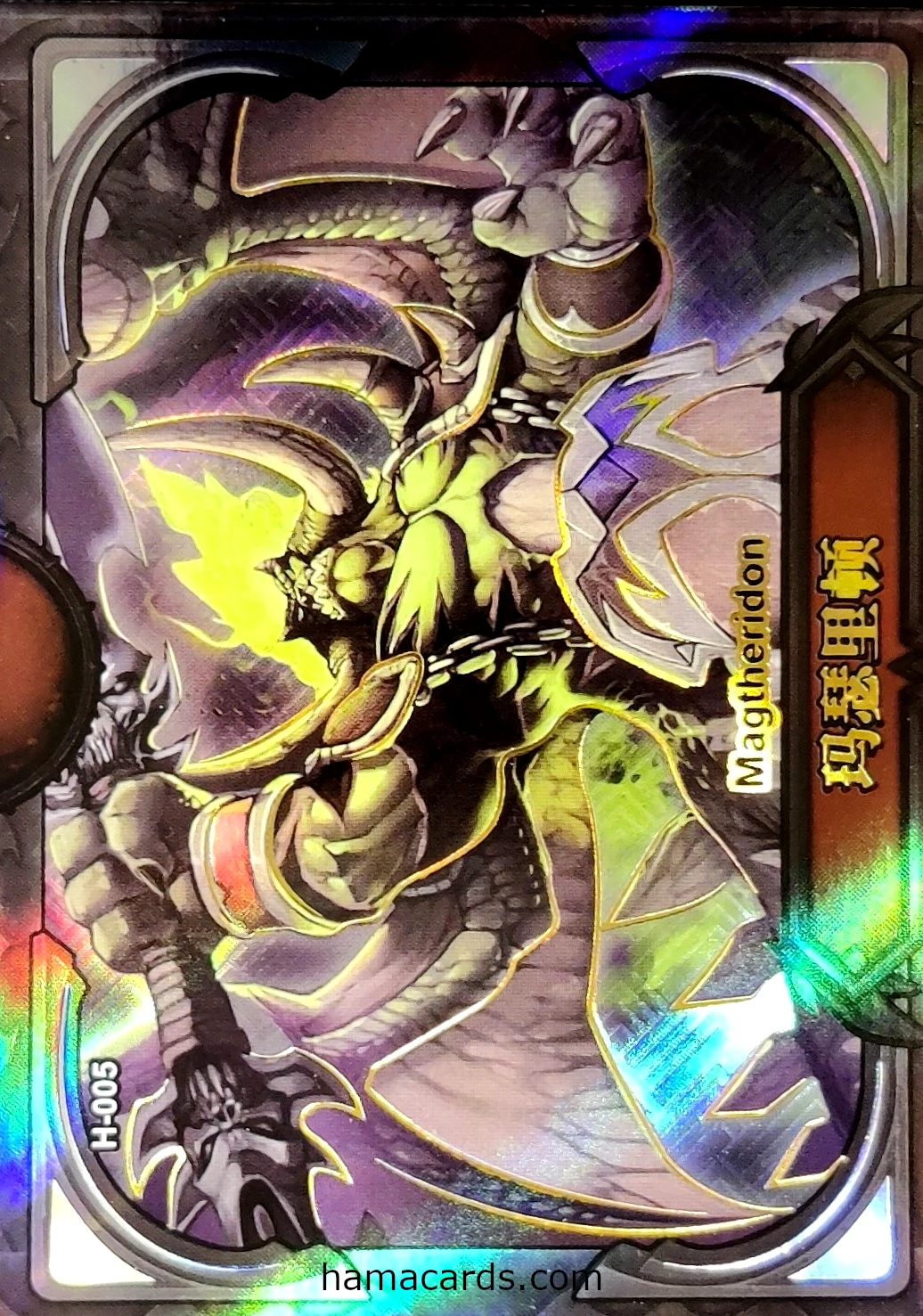 La carte H n°005 – Magtheridon provenant du CCG World of Warcraft (Série 1) vous permettra de replonger dans vos plus beaux souvenirs d’Azeroth et de sublimer vos classeurs de collection grâce à ses effets holographiques époustouflants ! En savoir plus
