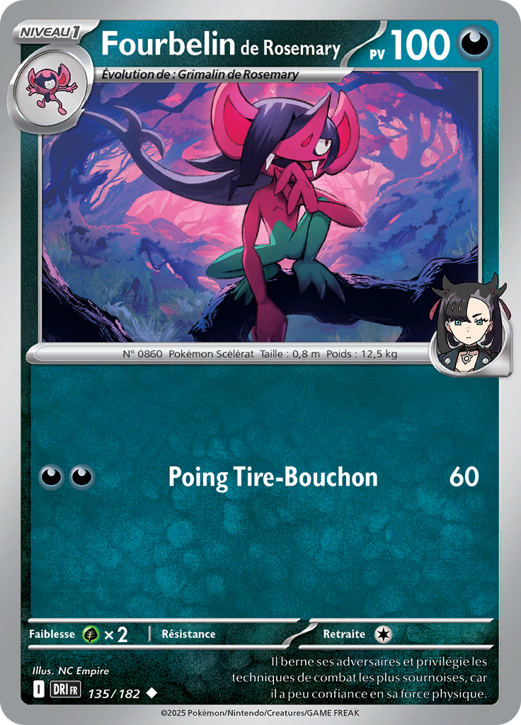 Découvrez la carte Pokémon Fourbelin de Rosemary 135/182, une carte Peu commune issue de la série Écarlate et Violet – Rivalités Destinées, une des dernières séries du bloc Écarlate et Violet.