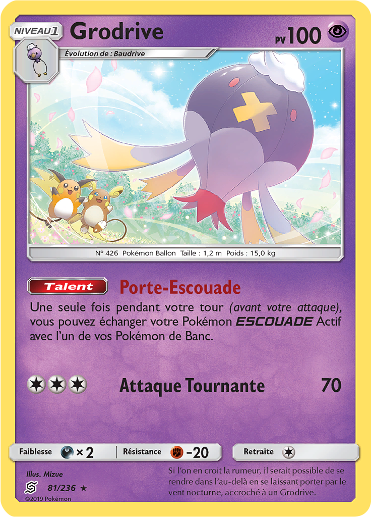 Découvrez la carte Pokémon Grodrive 81/236, une carte Rare issue de la série Soleil & Lune – Harmonie des Esprits (SL11), centrée sur les duos Pokémon GX Escouade tels que Mewtwo & Mew, Giratina & Carchacrok ou Raichu & Raichu d’Alola. Une extension majeure pour les collectionneurs et amateurs d’illustrations percutantes.