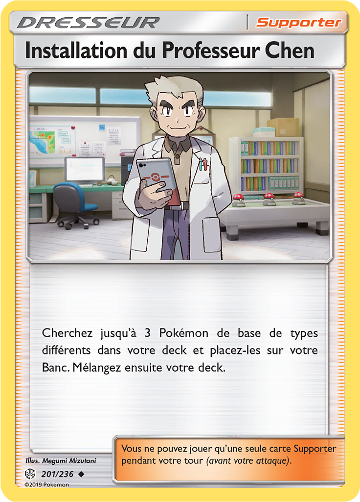 Découvrez la carte Pokémon Installation du Professeur Chen 201/236, une carte Peu commune issue de la série Soleil & Lune – Éclipse Cosmique (SL12), dernière extension du bloc Soleil & Lune. Elle met à l’honneur les duos Pokémon-GX ESCOUADE comme Arceus & Dialga & Palkia ou Reshiram & Zekrom, avec des illustrations marquantes. Un incontournable pour les collectionneurs et amateurs de belles cartes.