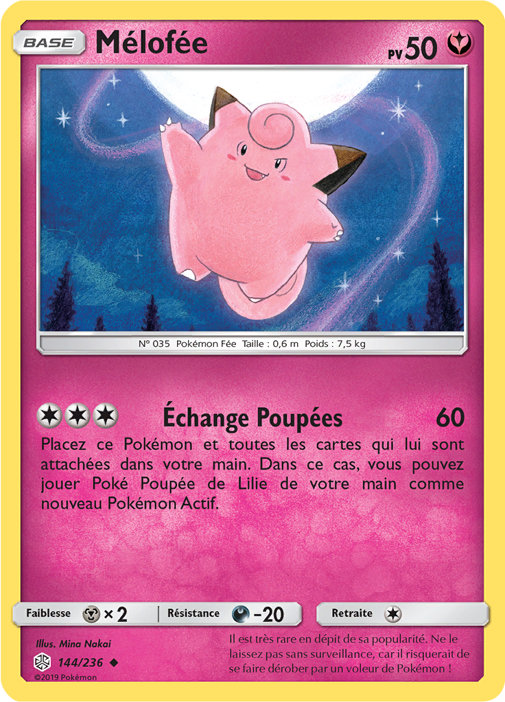 Découvrez la carte Pokémon Mélofée 144/236, une carte Peu commune issue de la série Soleil & Lune – Éclipse Cosmique (SL12), dernière extension du bloc Soleil & Lune. Elle met à l’honneur les duos Pokémon-GX ESCOUADE comme Arceus & Dialga & Palkia ou Reshiram & Zekrom, avec des illustrations marquantes. Un incontournable pour les collectionneurs et amateurs de belles cartes.