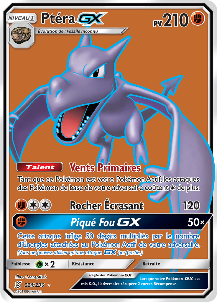 Découvrez la carte Pokémon Ptéra 224/236, une carte Full Art issue de la série Soleil & Lune – Harmonie des Esprits (SL11), centrée sur les duos Pokémon GX Escouade tels que Mewtwo & Mew, Giratina & Carchacrok ou Raichu & Raichu d’Alola. Une extension majeure pour les collectionneurs et amateurs d’illustrations percutantes.