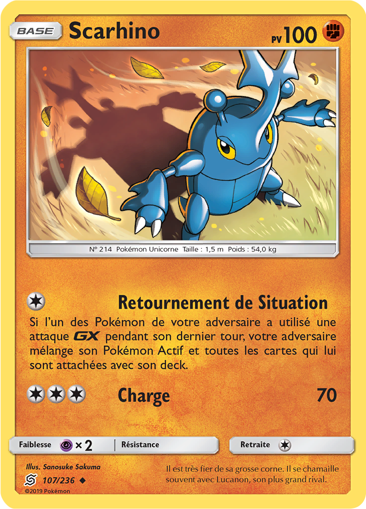 Découvrez la carte Pokémon Scarhino 107/236, une carte Peu commune issue de la série Soleil & Lune – Harmonie des Esprits (SL11), centrée sur les duos Pokémon GX Escouade tels que Mewtwo & Mew, Giratina & Carchacrok ou Raichu & Raichu d’Alola. Une extension majeure pour les collectionneurs et amateurs d’illustrations percutantes.