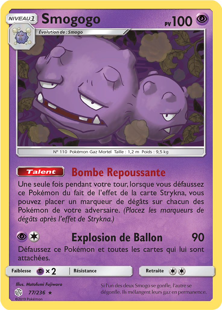 Découvrez la carte Pokémon Smogogo 77/236, une carte Rare issue de la série Soleil & Lune – Éclipse Cosmique (SL12), dernière extension du bloc Soleil & Lune. Elle met à l’honneur les duos Pokémon-GX ESCOUADE comme Arceus & Dialga & Palkia ou Reshiram & Zekrom, avec des illustrations marquantes. Un incontournable pour les collectionneurs et amateurs de belles cartes.