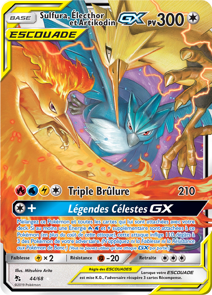 Découvrez la carte Pokémon Sulfura, Électhor et Artikodin 44/68, une carte GX issue de la série spéciale Soleil & Lune – Destinées Occultes (SL11.5), connue pour son sous-ensemble Shiny Vault regroupant de nombreux Pokémon chromatiques et des Pokémon GX emblématiques, dont Dracaufeu GX. Un must pour les collectionneurs de cartes brillantes.