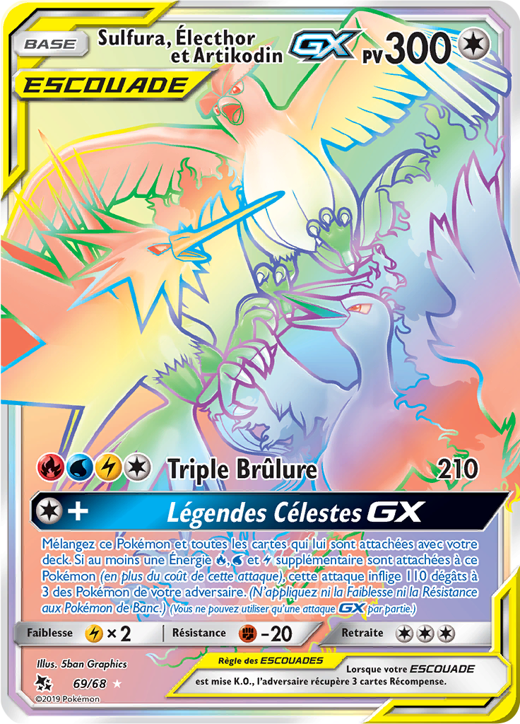 Découvrez la carte Pokémon Sulfura, Électhor et Artikodin 69/68, une carte Rainbow issue de la série spéciale Soleil & Lune – Destinées Occultes (SL11.5), connue pour son sous-ensemble Shiny Vault regroupant de nombreux Pokémon chromatiques et des Pokémon GX emblématiques, dont Dracaufeu GX. Un must pour les collectionneurs de cartes brillantes.